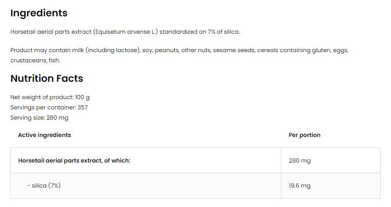 L'estratto di equiseto è ricco di minerali benefici e antiossidanti, che offrono numerosi benefici per la salute. L'assunzione di questo prodotto può migliorare la salute di capelli e unghie, poiché è noto per il suo alto contenuto di silice, importante per la loro crescita e resistenza. Inoltre, l'equiseto può favorire la perdita di peso stimolando il metabolismo e riducendo la ritenzione idrica. Studi scientifici hanno dimostrato che l'equiseto ha proprietà antinfiammatorie che aiutano ad alleviare il dolore articolare e a migliorare la flessibilità dei tessuti connettivi. L'estratto di equiseto agisce anche come diuretico naturale, contribuendo a depurare l'organismo e a ridurre il gonfiore. Contiene inoltre antiossidanti che combattono i radicali liberi e possono rallentare il processo di invecchiamento della pelle. È importante sottolineare che il prodotto non è adatto a donne in gravidanza o a persone con problemi renali. Prima dell'uso, si consiglia un consulto medico. Per acquistare l'estratto di equiseto al miglior rapporto qualità-prezzo, Feel You offre prezzi competitivi e prodotti di qualità. Nel nostro negozio puoi essere certo di ottenere la migliore qualità a un prezzo ragionevole! **Consulta la seconda foto del prodotto per la lista completa degli ingredienti.**