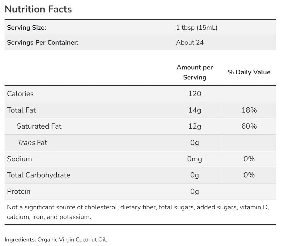 Avvertenze: Le persone allergiche al cocco o affette da specifiche patologie dovrebbero consultare un medico prima dell'uso. Un consumo eccessivo di grassi, anche provenienti da fonti salutari, può portare ad un aumento di peso.