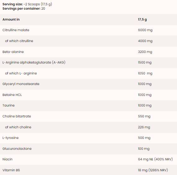 IL 6000 mg di citrullina malato i contenuti possono aiutare a migliorare le prestazioni fisiche e ad accelerare il recupero. 3200 mg di beta-alanina è noto per rallentare l'accumulo di acido lattico, riducendo l'affaticamento e aumentando le prestazioni durante gli allenamenti intensi. 1500 mg di L-Arginina (A-AKG) è un potente stimolante che aumenta la circolazione sanguigna e trasporta ossigeno ai muscoli.