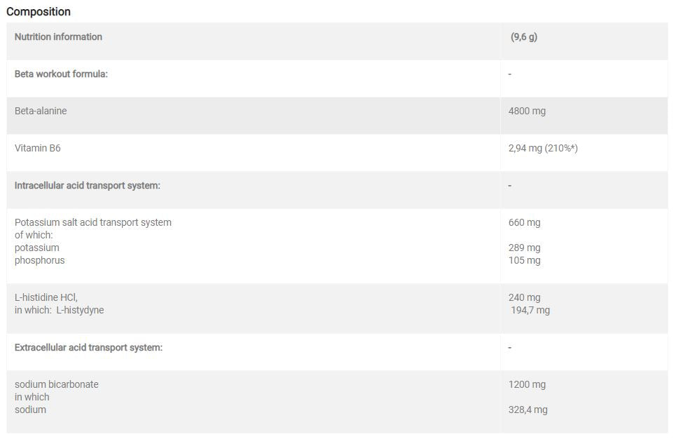 Ingredienti: Beta-alanina, vitamina B6, sali di potassio dell'acido ortofosforico, L-istidina HCL, bicarbonato di sodio