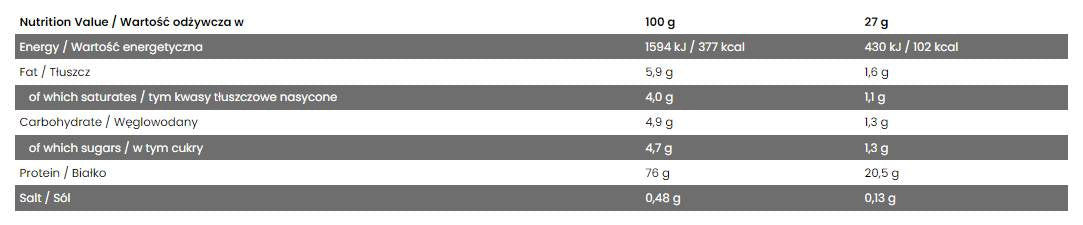 FA Nutrition Titanium Pro Plex 5 è un complesso proteico avanzato, essenziale per la corretta dieta di ogni atleta. La matrice contiene concentrato di proteine ​​del siero del latte (Carbelac®), isolato di proteine ​​del siero del latte ( ISOLAC® ), proteine ​​del siero del latte idrolizzate ( Optipep™ ), caseina idrolizzata ( PeptoPro® ) e albumina d'uovo. Tutti questi tipi di proteine ​​hanno caratteristiche e struttura diverse. Differiscono anche nel profilo aminoacidico e nel tempo di assorbimento.