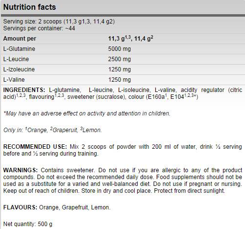 Glutammina - l'amminoacido più abbondante nel corpo umano. La glutammina è direttamente coinvolta nei processi anabolici e la sua carenza porta ad affaticamento e degradazione del tessuto muscolare. La glutammina previene la perdita di massa muscolare durante allenamenti intensi, malattie e stress. La glutammina riduce anche efficacemente il cortisolo;