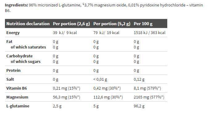 Ingredienti: 96% L-glutammina micronizzata, 3,7% ossido di magnesio, 0,01% piridossina cloridrato - vitamina B6.