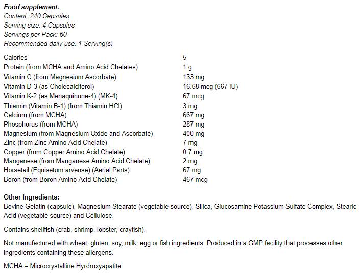 NOW® Bone Strength contiene microcristalline Idrossiapatite (MCHA) – un ingrediente completamente naturale che costituisce la struttura cristallina di ossa e denti. MCHA È una fonte di minerali altamente assimilabili, calcio e fosforo, che sono i principali elementi strutturali delle ossa. NOW® Bone Strength™ contiene oligoelementi e vitamine C, D e K, che contribuiscono ai processi di costruzione e rinnovamento del tessuto osseo.