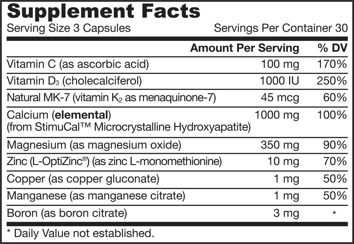 StimuCal™ è combinato con vitamina D3 E vitamina K2 (come MK-7 ottenuto tramite un processo di fermentazione naturale [una forma di vitamina K più biodisponibile]) per promuovere la deposizione di calcio nella matrice ossea, mantenendo così l'integrità scheletrica e supportando allo stesso tempo la salute cardiovascolare e arteriosa.