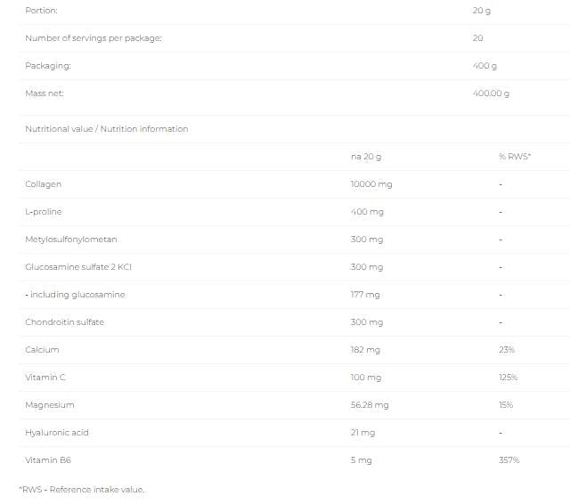 • Ricco contenuto di principi attivi: Ogni porzione contiene collagene, glucosamina, condroitina, MSM e acido ialuronico.