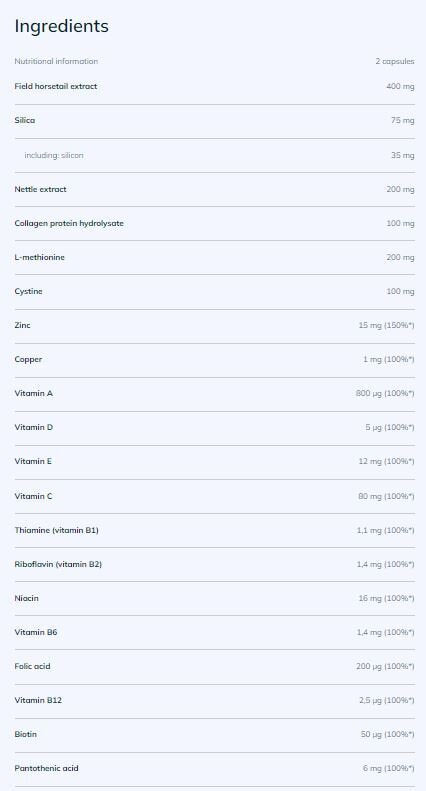 Ingredienti: estratto di equiseto (Equisetum arvense L.), vitamine [acido L-ascorbico – vitamina C, acetato di DL-alfa-tocoferile – vitamina E, nicotinamide – niacina, acetato di retinile – vitamina A, calcio D-pantotenato – acido pantotenico, cianocobalamina – vitamina B12, colecalciferolo – vitamina D, cloridrato di piridossina – vitamina B6, riboflavina – vitamina B2, mononitrato di tiamina – tiamina (vitamina B1), acido pteroilmonoglutammico – acido folico, D-biotina – biotina], L-metionina (estratto di foglie di ortica dioica L.), gluconato di zinco, cistina, idrolizzato proteico del collagene, biossido di silicio, gluconato di rame (II), agente di carica – cellulosa; agente antiagglomerante – sali di magnesio degli acidi grassi; capsula (gelatina, colorante – E 171)