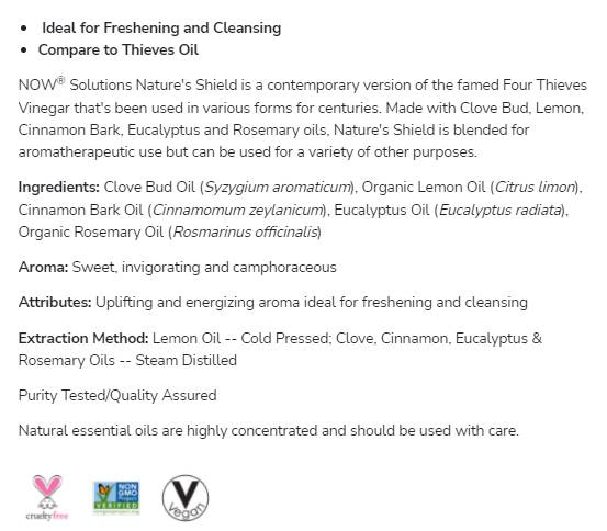 NOW® Soluzioni Scudo della Natura è una versione moderna del famoso aceto Four Thieves, che è stato utilizzato in varie forme per secoli. Realizzato con oli di chiodi di garofano, limone, corteccia di cannella, eucalipto e rosmarino, Nature's Shield è miscelato per uso aromaterapico, ma può anche essere utilizzato per una varietà di altri scopi.