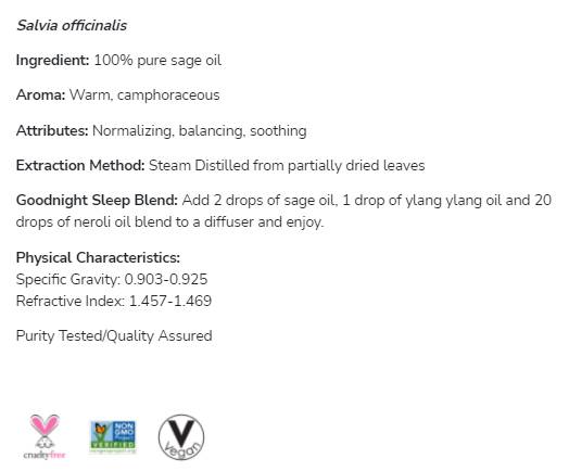 Avvertenze: Non utilizzare l'olio di salvia sclarea in caso di gravidanza o allattamento. In caso di intolleranza individuale agli ingredienti, è necessario consultare un medico prima dell'uso.