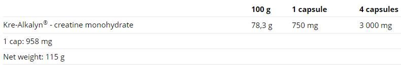 KRE-ALKALYN®1500 È una moderna forma brevettata di creatina con eccellente stabilità e assorbimento da parte dell'organismo. 1500 mg di creatina per dose. Adatto agli atleti che desiderano aumentare il volume e la forza muscolare.