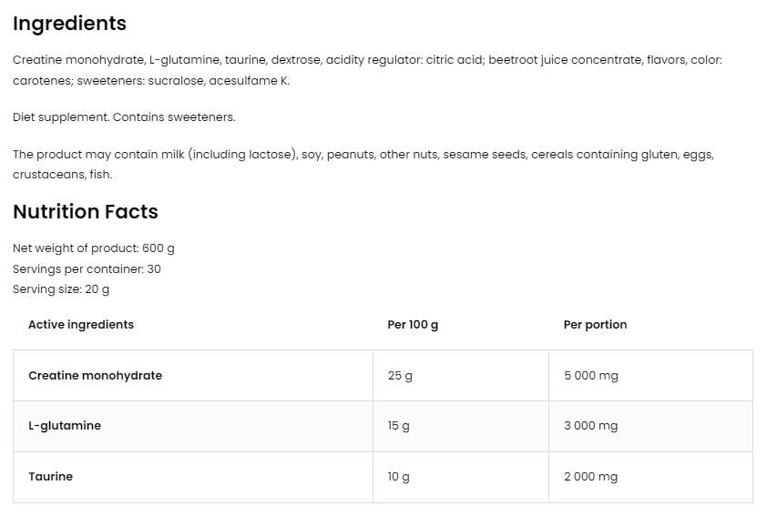 Studi scientifici hanno dimostrato che l'azione combinata di questi ingredienti può portare a significativi miglioramenti nelle prestazioni atletiche e nel recupero fisico. Ad esempio, la creatina è associata all'aumento della forza e delle dimensioni muscolari, mentre la glutammina agisce come fonte primaria di energia per le cellule muscolari, soprattutto dopo allenamenti intensi. La taurina è nota per le sue proprietà antiossidanti e la capacità di migliorare le prestazioni fisiche generali.