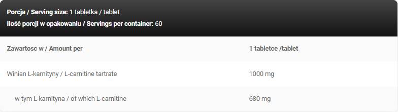 Ingredienti: L-carnitina tartrato, agenti antiagglomeranti (E341, E470b, E551).