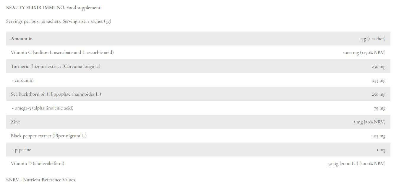 Elisir di bellezza immuno è un integratore alimentare che supporta il sistema immunitario, contenente vitamine C e D3, curcumina, zinco e piperina. Non contiene conservanti, coloranti e aromi artificiali, né zuccheri e dolcificanti aggiunti.