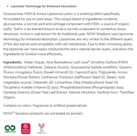 Lozione liposomiale con glucosamina, MSM e arnica È una lozione lenitiva specificamente formulata per l'uso sulle articolazioni. Questa combinazione unica di ingredienti combina la glucosamina, un componente normale di articolazioni e cartilagine, con l'MSM, una fonte di zolfo organico. Zolfo È un elemento noto per essere un componente normale delle strutture del tessuto connettivo. L'arnica è ben nota per i suoi usi tradizionali. Soluzioni NOW Utilizza la tecnologia liposomiale per un assorbimento migliorato. I liposomi assomigliano molto ai vari strati della barriera cutanea e sono compatibili con le membrane cellulari. Grazie alla loro capacità di mimetizzarsi, i liposomi possono idratare più facilmente gli strati barriera naturali della pelle e consentire agli ingredienti di agire in modo più efficace.