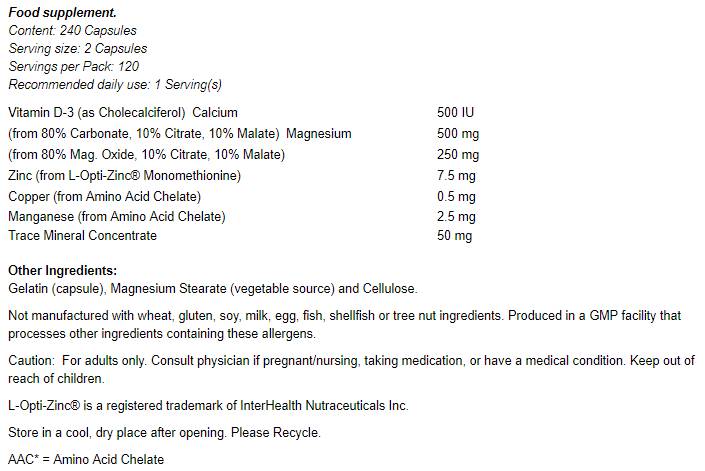 Derivata dal carbonato di calcio di alta qualità, questa fonte offre più milligrammi di calcio per unità di volume rispetto a qualsiasi altra sul mercato. Il calcio è l'elemento più abbondante nel corpo umano . È indispensabile per la formazione e la riparazione delle ossa e dei denti, ma è anche molto importante per le contrazioni muscolari, la coagulazione del sangue, un elemento costitutivo delle membrane cellulari, la trasmissione degli impulsi nervosi, così come per altri processi metabolici Il calcio è raccomandato per il trattamento dell'osteoporosi, delle allergie, delle malattie della pelle come l'eczema e la psoriasi e dei danni al fegato.