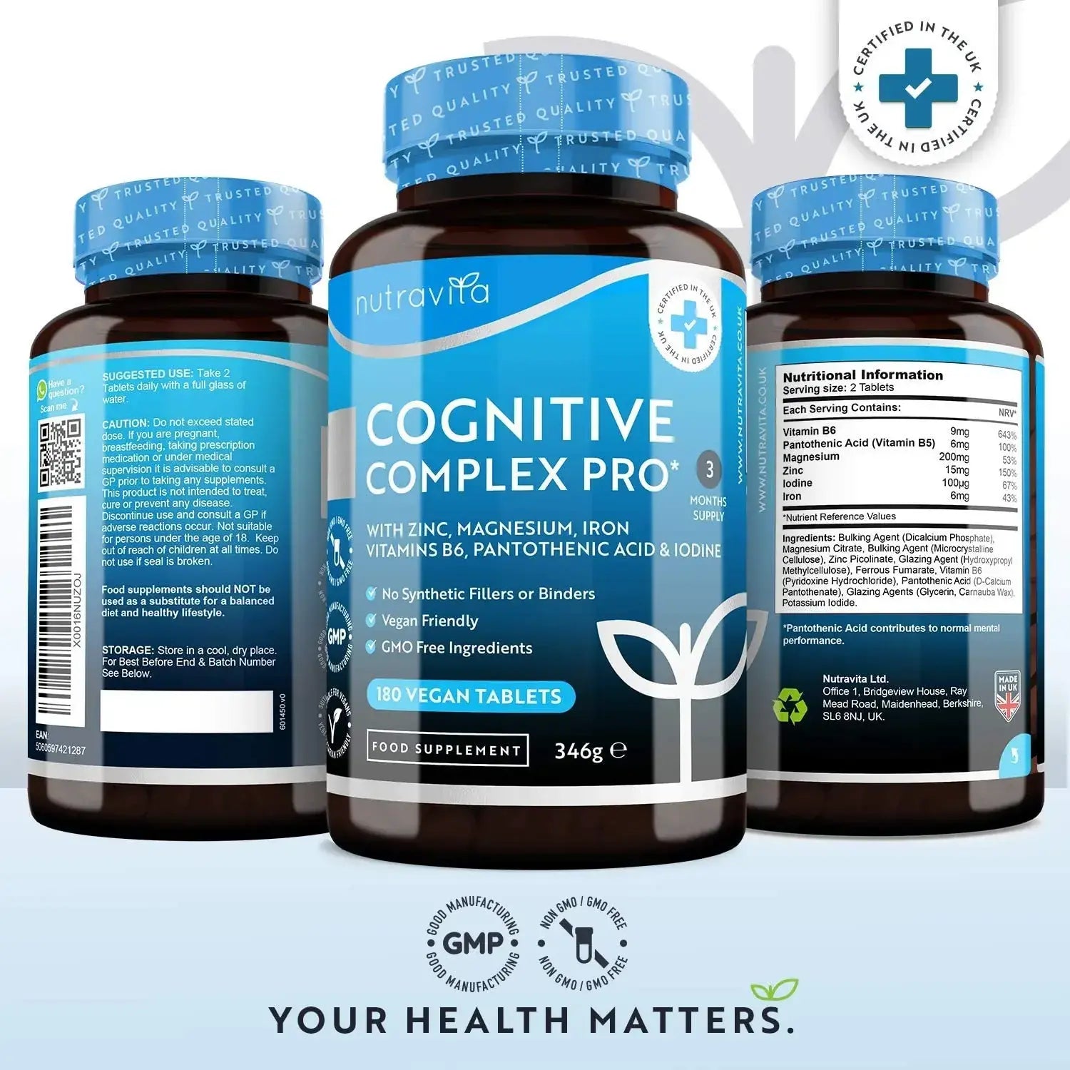 Cognitive Complex Pro è specificamente formulato per supportare la salute cognitiva attraverso una combinazione unica di nutrienti essenziali. Il contenuto di acido pantotenico, zinco e iodio svolge un ruolo importante nella normale funzione cerebrale. Le vitamine B6 e magnesio promuovono la stabilità psicologica, mentre il ferro è fondamentale per il metabolismo energetico cellulare. Supportato da ricerche scientifiche e approvato dall'EFSA, il nostro prodotto offre molteplici benefici per l'attività mentale.