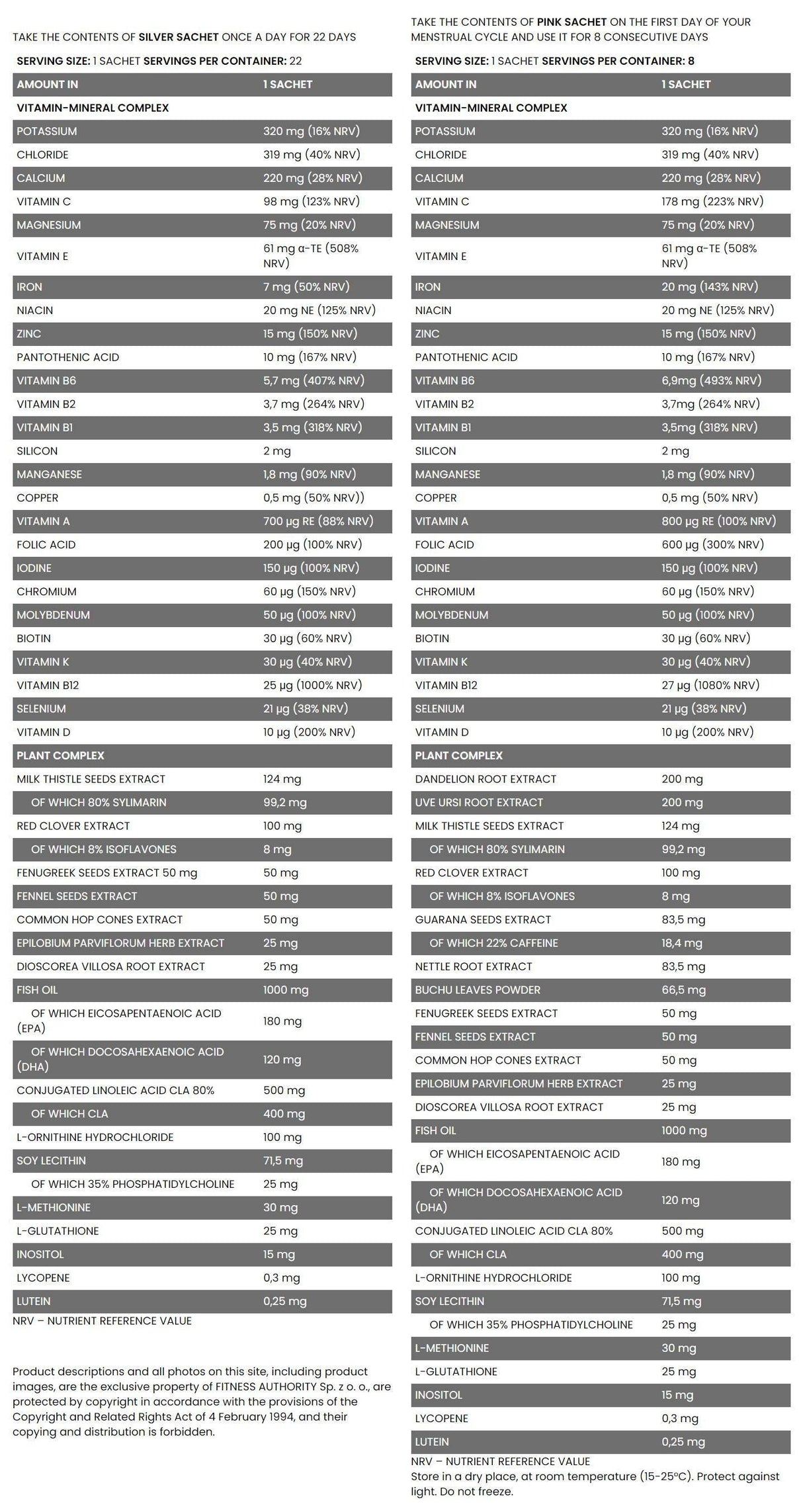 La confezione contiene 22 bustine argentate e 8 bustine rosa. Le bustine rosa si assumono dal primo giorno del ciclo mestruale fino alla sua conclusione, per circa 8 giorni consecutivi. Le bustine argentate si assumono nei restanti giorni del mese.