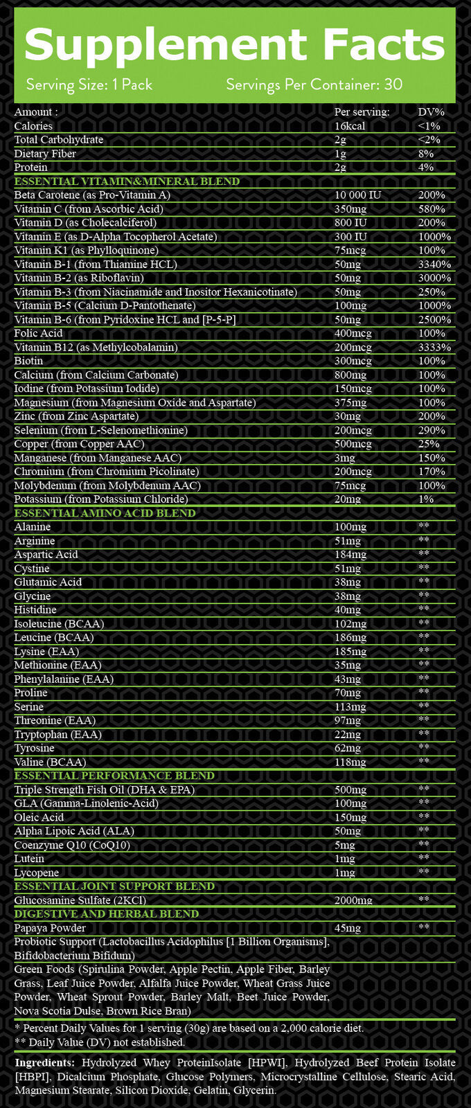La ricerca scientifica dimostra che gli amminoacidi essenziali e gli oligoelementi sono fondamentali per la riparazione del tessuto muscolare e per il miglioramento della resistenza fisica complessiva. Anche le vitamine del gruppo B, così come le vitamine C e D, svolgono un ruolo importante nel metabolismo e nella funzione immunitaria.