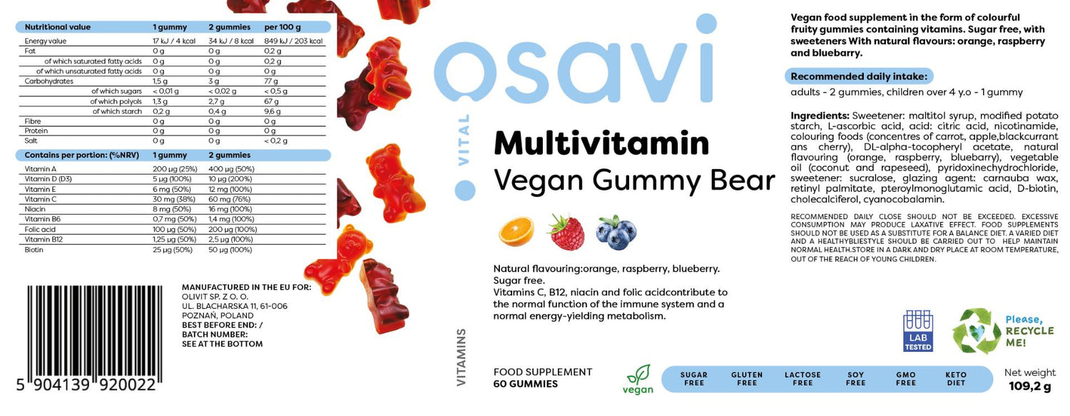 Orso gommoso vegano multivitaminico | Arancia, lampone, mirtillo - 60 caramelle gommose