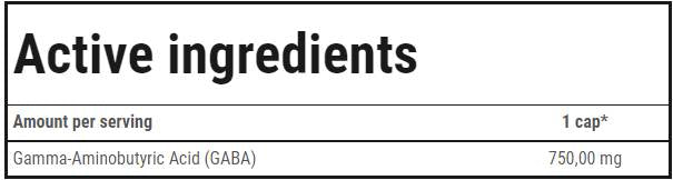 COMPOSIZIONE: acido gamma-amminobutirrico (GABA) (85,2%); involucro della capsula (gelatina; colorante: biossido di titanio); agente antiagglomerante: sali di magnesio degli acidi grassi.
