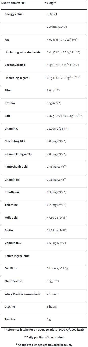 Trec Boogie Oat Gainer - La composizione è anche ricca di fibre alimentari, molto importanti per il corpo umano e il suo funzionamento. Possiede numerose proprietà preziose, tra cui il gonfiore di stomaco, che si manifesta nel suo riempimento e limita quindi l'appetito inutile e la sensazione di vuoto costante. Naturalmente, non viene digerito, quindi non aumenta il valore calorico totale del cibo. Va inoltre ricordato che il suo corretto apporto è di grande importanza per il corretto funzionamento dell'apparato digerente e in particolare per la peristalsi intestinale. Come potete vedere, si tratta di un prodotto molto equilibrato, la cui formula si basa su nutrienti accuratamente selezionati. Non investite in mezze misure e scegliete BOOGIE OAT GAINER .