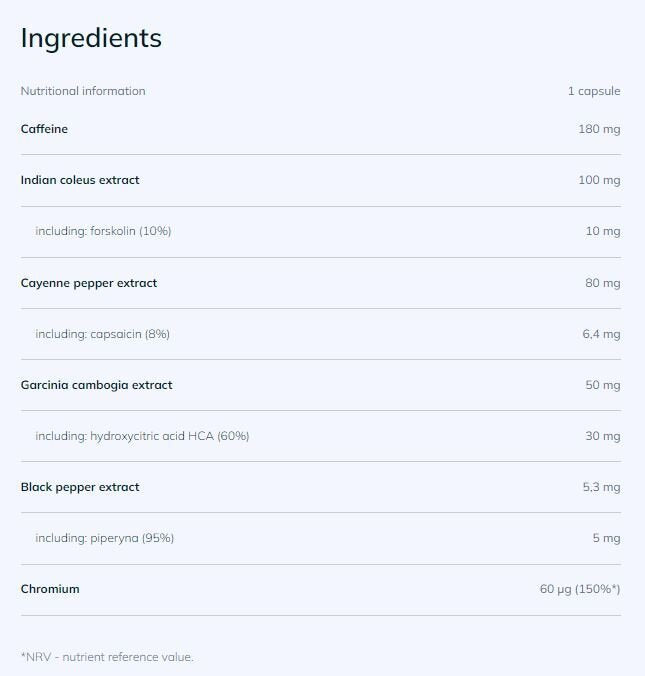 Ingredienti: caffeina anidra, agente di carica: cellulosa microcristallina; estratto di coleus indiano (Coleus forskohlii), estratto di peperoncino (Capsicum annuum L.), estratto di buccia di frutto di garcinia cambogia, agenti antiagglomeranti: sali di magnesio degli acidi grassi, biossido di silicio; estratto di pepe nero Bioperine® (Piper nigrum L.), picolinato di cromo, capsula (componenti di rivestimento: gelatina, colorante: E 171)