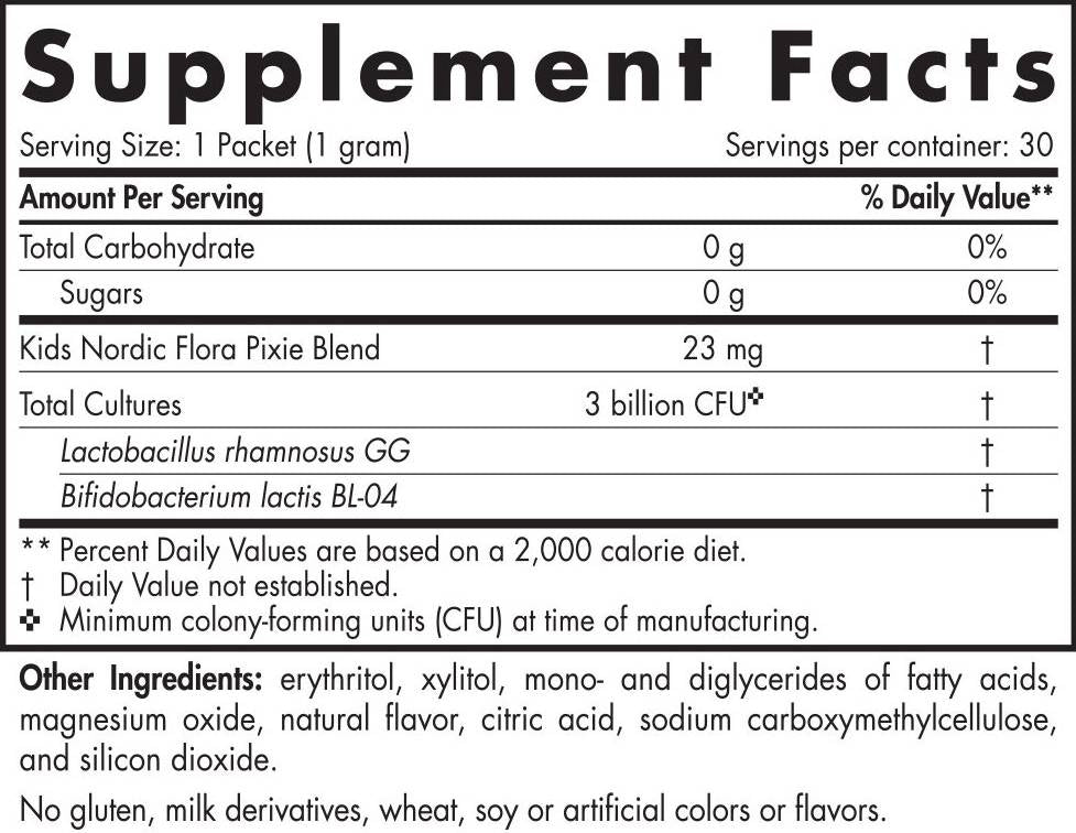 Nordic Flora Kids Probiotic Pixies | 3 miliardi di cellule attive è una polvere probiotica al gusto di frutti di bosco, piacevole da assumere, per la salute digestiva, immunitaria e respiratoria.