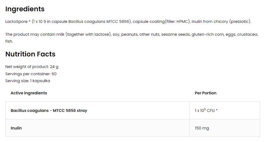 Il Lactobacillus sporogenes (LactoSpore®) è un probiotico unico, estremamente resistente alle condizioni avverse, che ne garantisce l'efficacia. È stato dimostrato che l'assunzione regolare di probiotici può contribuire a ridurre stress e ansia, sopprimere i processi infiammatori e persino a preservare la salute della pelle. Studi scientifici dimostrano che LactoSpore® può anche aiutare le persone intolleranti al lattosio, migliorandone l'assorbimento nell'organismo.