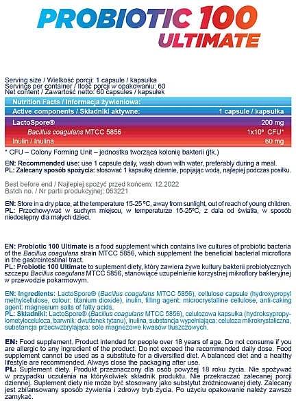 Questo prodotto è particolarmente utile durante periodi di stress o dopo l'assunzione di antibiotici, quando la microflora intestinale è alterata. Probiotic 100 Ultimate aiuta ad assorbire meglio i nutrienti e a produrre vitamine del gruppo B, importanti per il metabolismo energetico.
