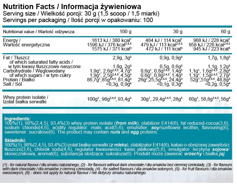 Ingredienti: 98% proteine ​​del siero del latte isolate (da latte), emulsionante: lecitina di soia/girasole, edulcorante: sucralosio