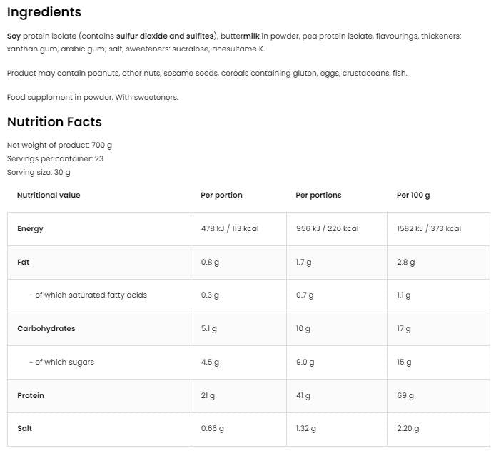Il frullato proteico di soia e piselli è la scelta perfetta per chi desidera aumentare l'apporto proteico in modo naturale. Questo prodotto offre una combinazione di proteine ​​vegetali che non solo aiutano a sviluppare la massa muscolare, ma forniscono anche l'energia necessaria per uno stile di vita attivo. L'assunzione regolare di proteine ​​aiuta a riparare i muscoli dopo l'esercizio fisico e può ridurre i tempi di recupero. Inoltre, è ricco di aminoacidi, che svolgono un ruolo chiave nel metabolismo e nel mantenimento del sistema immunitario.