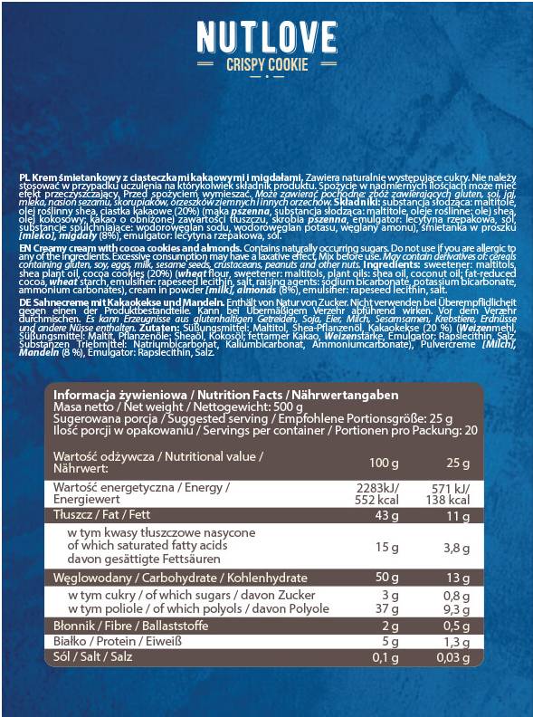Grazie al suo elevato contenuto proteico, NutLove favorisce il recupero muscolare dopo l'allenamento ed è un'ottima scelta per la colazione o come dessert. Inoltre, la crema spalmabile è a basso contenuto di zuccheri, il che la rende adatta a chi è attento all'apporto calorico. La varietà di gusti soddisferà ogni palato e aggiungerà varietà alla vostra dieta quotidiana.