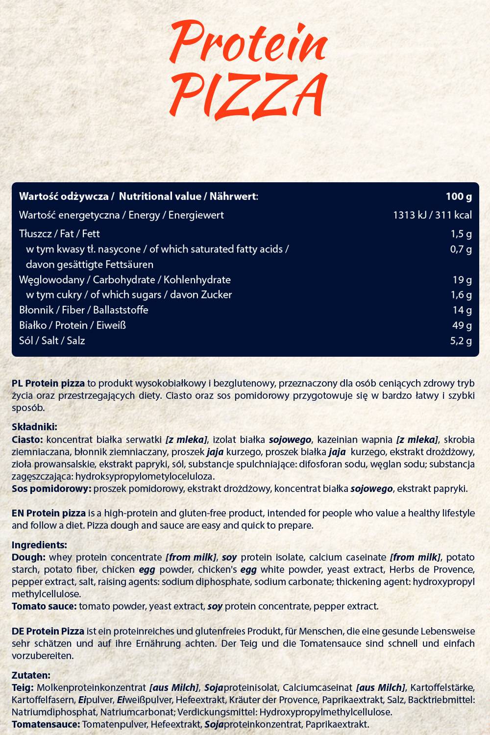 Protein Pizza, il nostro marchio numero uno di integratori liquidi, è la scelta ideale per chi desidera gustare un pasto delizioso senza compromessi. Grazie al suo alto contenuto proteico, questo prodotto è estremamente utile per il mantenimento e lo sviluppo della massa muscolare, offrendo al contempo un'alimentazione equilibrata. La formula senza glutine lo rende adatto anche a chi soffre di intolleranza al glutine.