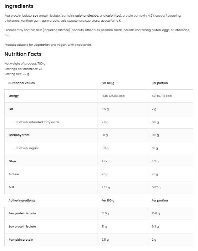 Vegan Protein Mix contiene una combinazione sinergica di proteine ​​di pisello, soia e zucca, che fornisce un profilo aminoacidico completo, necessario per il funzionamento ottimale dell'organismo. Questa formula è specificamente progettata per fornire i nutrienti necessari per uno stile di vita attivo, pur essendo completamente vegetale e facilmente digeribile.