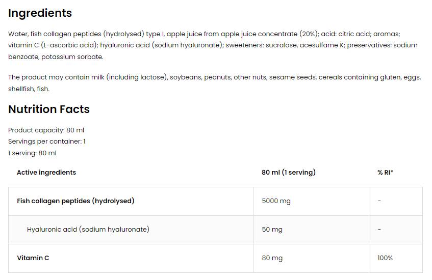 OstroVit Shot di collagene marino è un insieme di tre principi attivi sotto forma di shot al gusto di cocco e pesca. OstroVit colpi contengono, tra gli altri, peptidi di pesce collagene tipo I , acido ialuronico E vitamina C. Il prodotto è pensato per tutte le persone che hanno a cuore l'aspetto bello e sano della pelle, nonché per chi pratica sport, dopo infortuni sportivi o esercizi intensi, durante la convalescenza da fratture e per la rigenerazione delle articolazioni danneggiate.