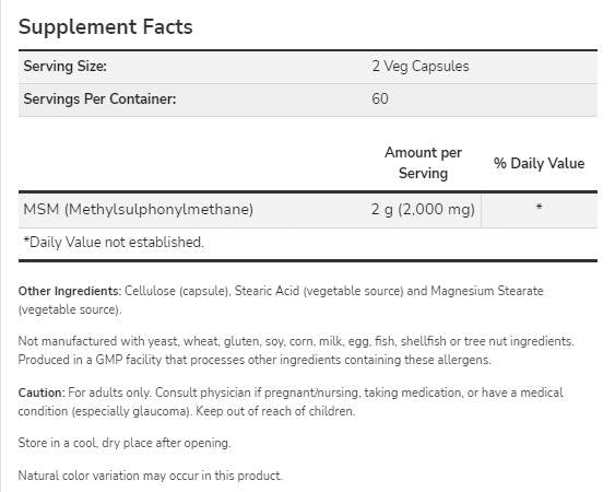 MSM (metilsulfonilmetano) È una forma naturale di zolfo organico presente nei tessuti di tutti gli organismi viventi. Non si trova negli alimenti conservati a lungo o trattati in modo diverso. MSM si lega all'umidità e scompare con essa quando si disidrata.