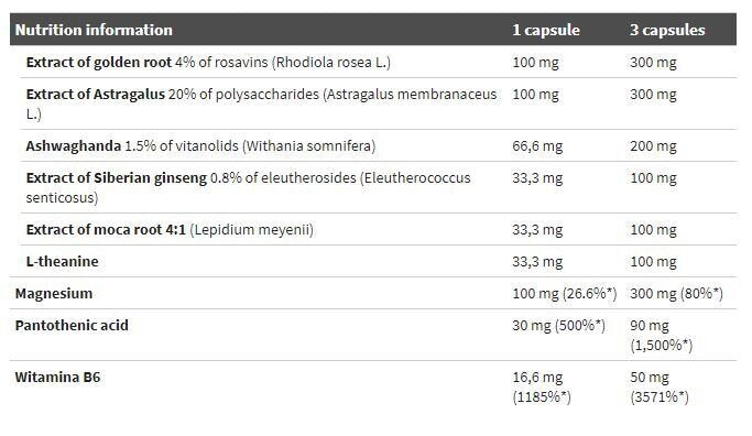 Ingredienti: estratto di radice d'oro, estratto di astragalo, estratto di ashwagandha, estratto di ginseng siberiano, estratto di radice di maca, L-teanina, ossido di magnesio, calcio D-pantotenato - acido pantotenico, piridossina cloridrato (vitamina B6), riempitivo microcristallino, cellulosa stearato di magnesio - agente antiagglomerante, capsula (gelatina - ingrediente di rivestimento, colorante: E171)