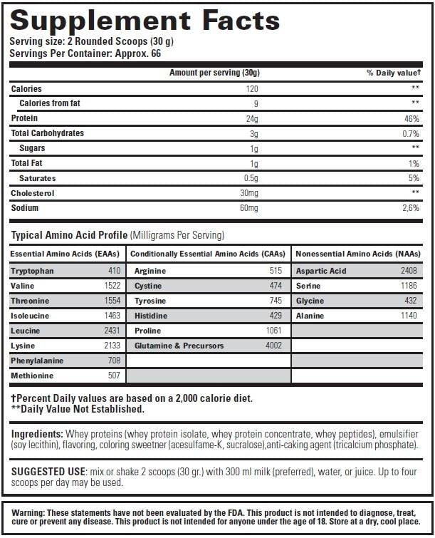Se si guardano attentamente le etichette, la maggior parte delle proteine ​​più diffuse contiene un'alta percentuale di carboidrati. Non fatevi ingannare! Quello che volete è proteine ​​(massa muscolare magra), non aumento di peso (aumento di massa e grasso). Ecco perché 100% SIERO DI LATTE contiene un'alta percentuale di proteine ​​della migliore qualità.