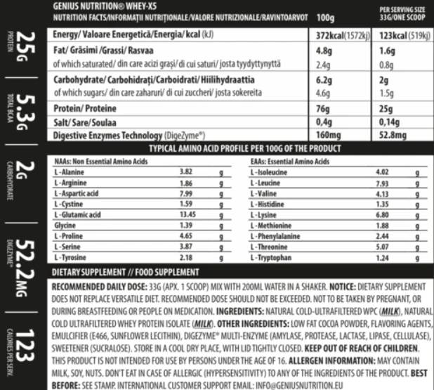 WHEY-X5 è formulato con precisione per aiutarti a costruire e mantenere la massa muscolare magra. Questo risultato è ottenuto grazie al rapido assorbimento di proteine ​​del siero del latte isolate e concentrate. Utilizziamo i migliori aminoacidi possibili con un'elevata dose di BCAA (5,3 g per dose), naturalmente presenti nelle proteine ​​del siero del latte. Genius Nutrition utilizza proteine ​​del siero del latte al 100% di altissima qualità, ottenute tramite filtrazione naturale, che hanno elevate proprietà di assorbimento e digestione, combinate con DIGEZYME® (enzimi digestivi). WHEY-X5 ha proprietà nutrizionali superiori, importanti per chiunque voglia costruire massa muscolare senza accumulare grasso, e ha un sapore straordinario.