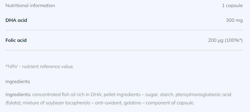 Olimp DHA d'oro/30 capsule contiene acido folico e acido docosaesaenoico nella quantità e nel rapporto perfetti per soddisfare le esigenze dell'organismo femminile e del feto durante la gravidanza.