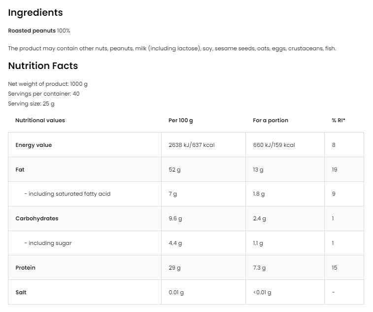 I grassi buoni di qualità OstroVit Nut Vit 100% Burro di Arachidi Sono importanti per il corpo umano. Solitamente, il contenuto di grassi in un barattolo di prodotto raggiunge il 30-50%, il 30% è costituito da proteine e meno del 20% da carboidrati. In generale, le arachidi sono ricche di vitamine come A, D ed E, importanti per il metabolismo, il cuore, la pelle, le ossa, ecc. Grazie al loro elevato contenuto di niacina (vitamina B3), le arachidi e il burro di arachidi non raffinato sono molto importanti se vogliamo avere una pelle bella e sana.