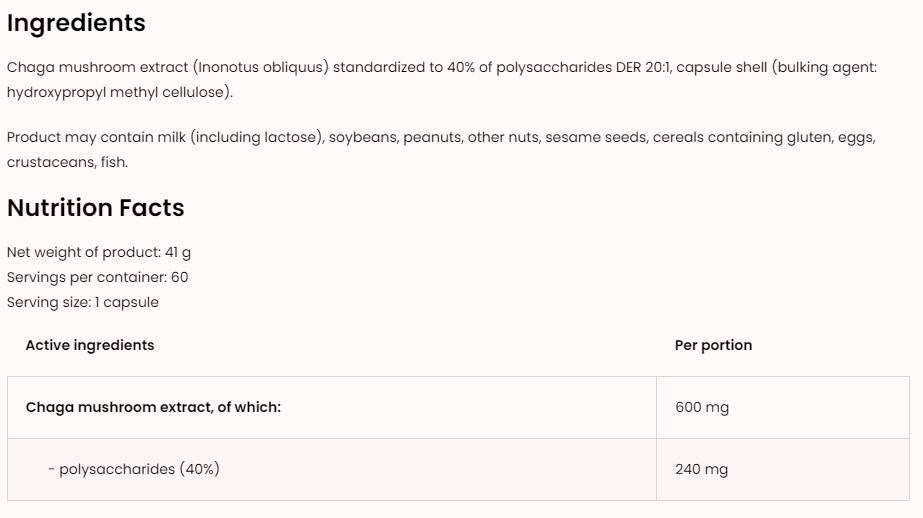 Il chaga, noto anche come "fungo nero", è un potente prodotto naturale ricco di antiossidanti, vitamine e minerali. L'assunzione di capsule di chaga da 600 mg può contribuire a rafforzare il sistema immunitario e a fornire energia e resistenza, caratteristiche particolarmente importanti per le persone attive. Questo fungo offre anche numerosi benefici per il sistema cardiovascolare e favorisce la salute della pelle, grazie alle sue proprietà antinfiammatorie.