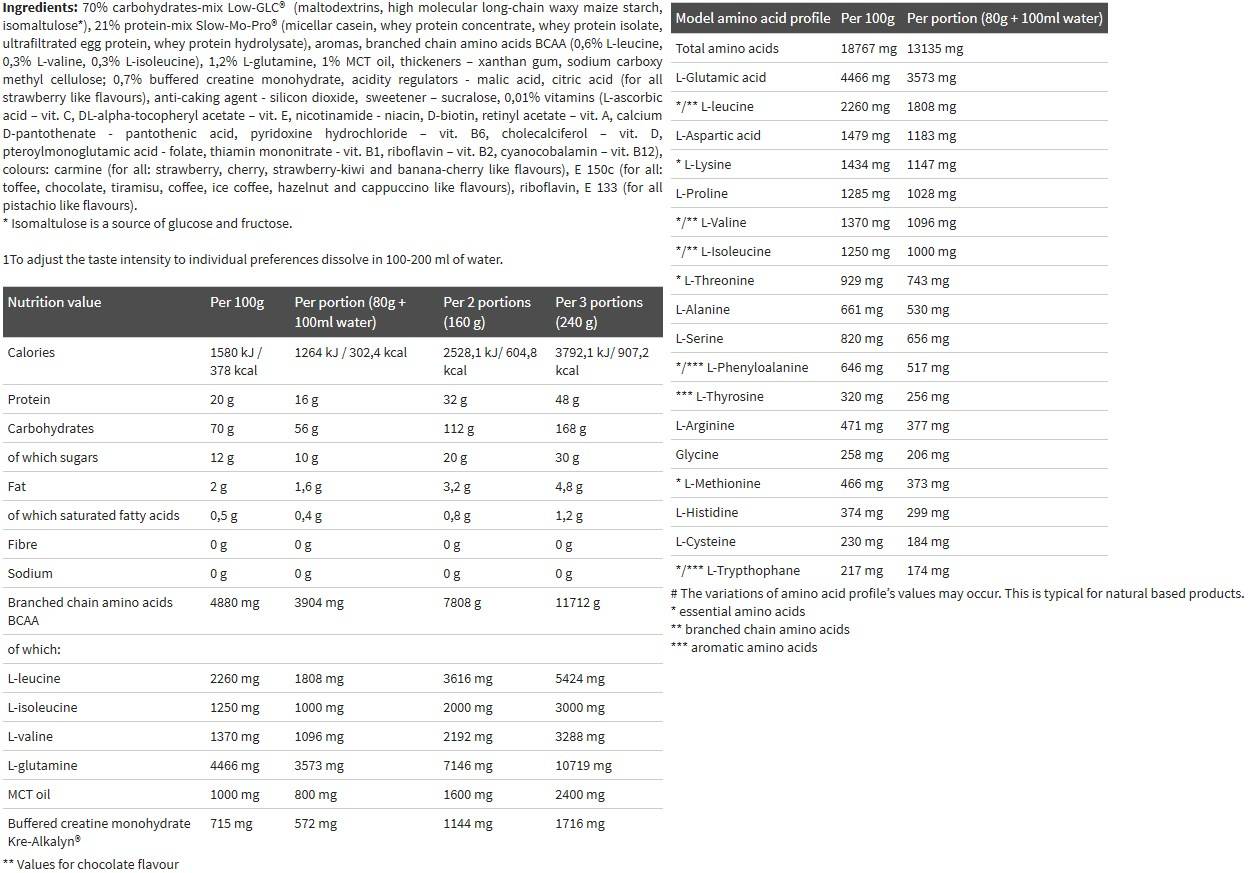 Una composizione ampliata di carboidrati accuratamente selezionati - Low GLC™ con aggiunta proteine ​​animali complete - Slow-Mo-Pro™ , le cui azioni sinergiche causeranno un'esplosione nei muscoli a causa della saturazione di nutrienti.