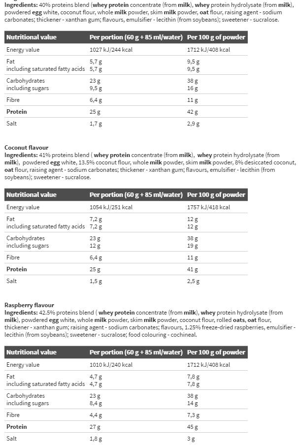 Indicazioni: Sciogliere 1 porzione (60 g = 1,5 misurini) in 85 ml di acqua. Mescolare fino a ottenere una miscela omogenea.