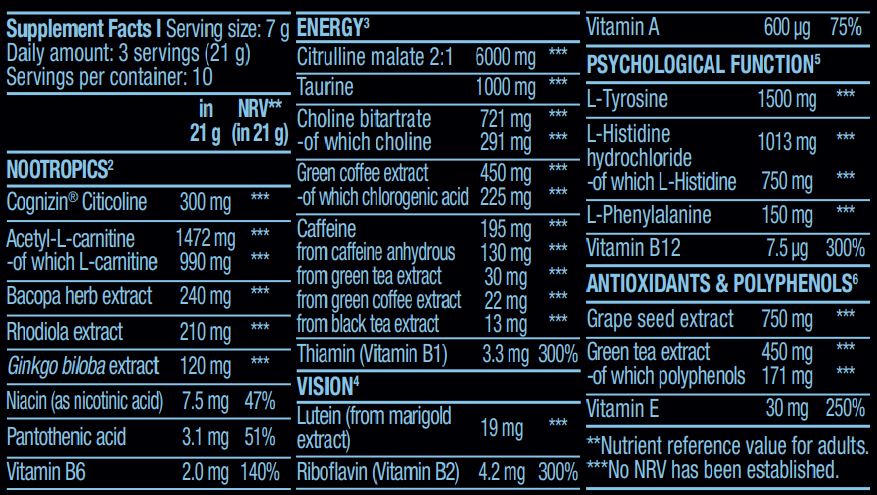 La formula include L-citrullina, L-tirosina, acetil-L-carnitina, taurina e molti altri, accuratamente selezionati per garantire risultati ottimali. Per la composizione completa del prodotto, vedere la seconda immagine.