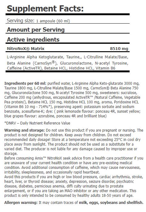 AMIX Nitro Nox ® Shot Box/20 x 60 ml è un integratore alimentare innovativo studiato per aumentare forza e resistenza durante l'attività fisica. Grazie alla sua formula potente, il prodotto non solo fornisce l'energia necessaria, ma migliora anche la concentrazione mentale e l'umore, fattori importanti per ottenere risultati ottimali. L'assunzione di Nitro Nox migliora la vascolarizzazione, che si traduce in un migliore pompaggio muscolare e massimizza l'assorbimento dei nutrienti necessari per la crescita e il recupero muscolare.