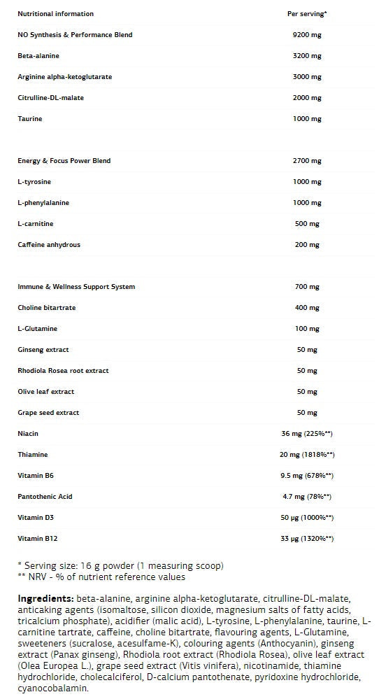 Questa bevanda pre-allenamento contiene un complesso di ingredienti che stimolano l'organismo, come caffeina anidra e taurina. Stimoleranno sicuramente il rilascio di adrenalina, che mobiliterà i percorsi energetici del sistema per svolgere più lavoro di allenamento. Il complesso principale di ingredienti di Avviatore NOX sono ottimizzatori energetici che aumentano la forza e l'efficienza muscolare: beta-alanina, inosina, nonché arginina e citrullina. La composizione di Avviatore NOX contiene una dose elevata di beta-alanina, un amminoacido che aumenta la concentrazione muscolare del peptide carnosina.