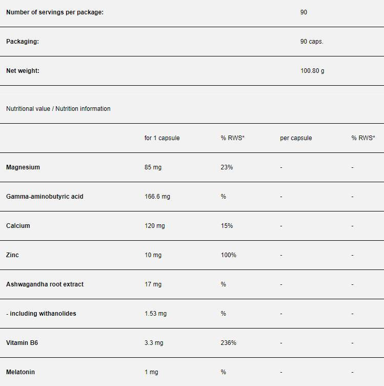 Sport Definition AIUTO PER IL SONNO è una formula di alta qualità basata sui migliori ingredienti attivi, nelle giuste dosi per garantire un effetto ottimale. Includendo l'integratore nel tuo regime alimentare, non solo migliorerai la qualità del tuo sonno, ma influenzerai anche la tua salute generale. Utilizzando la sinergia tra zinco, magnesio e vitamina B6, Sleep Aid aumenta la produzione di testosterone. L'obiettivo principale dell'integratore, ovvero un sonno profondo e profondo, si raggiunge grazie alla presenza di acido gamma-amminobutirrico (GABA) e della giusta quantità di melatonina.